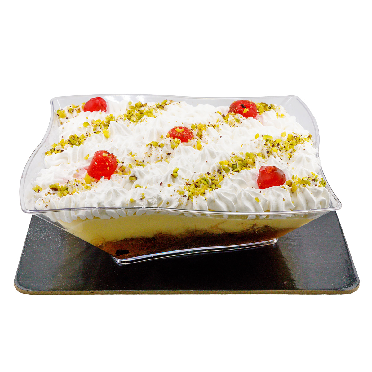Ανάλαφρο, δροσερό και αρωματικό, το εκμέκ Γαλυφιανάκης συνδυάζει τραγανή βάση κανταϊφιού με αφράτη κρέμα και πλούσια επικάλυψη σαντιγί. Ολοκληρώνεται με φιστίκι Αιγίνης και κερασάκια, δημιουργώντας ένα εκλεπτυσμένο γλυκό με ισορροπημένη γλύκα και φίνα υφή. Ιδανικό για το οικογενειακό τραπέζι ή για κέρασμα.