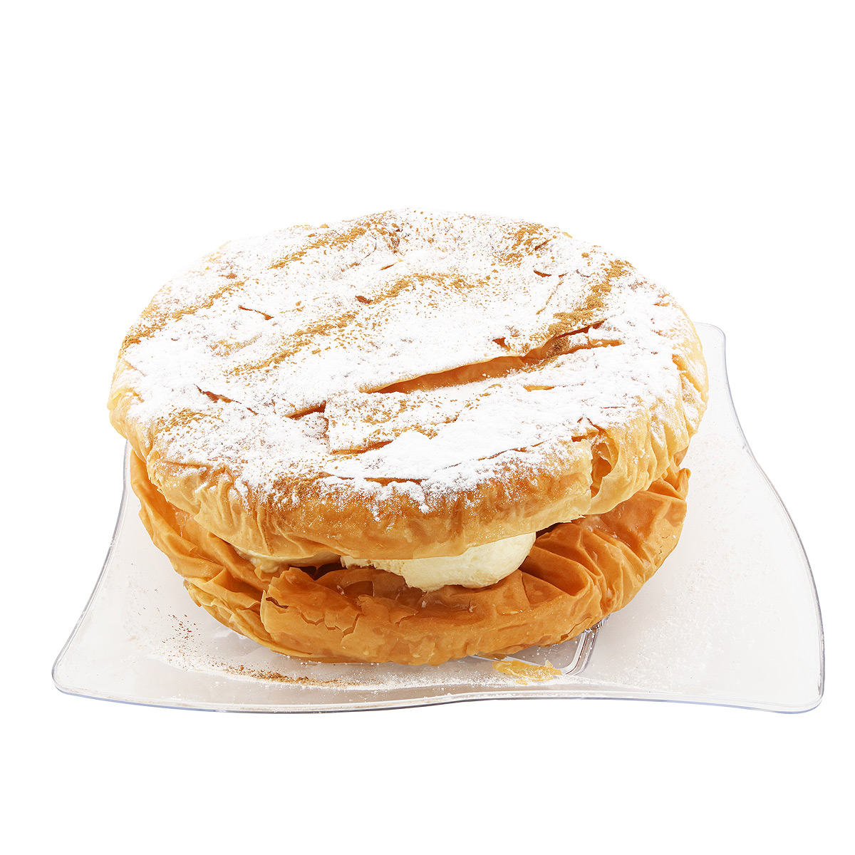 Η αγαπημένη γεύση γαλακτομπούρεκο… σε παγωτό! Αφράτο παγωτό βανίλια γεμίζει τραγανό φύλλο, πασπαλισμένο με ζάχαρη άχνη και κανέλα, θυμίζοντας το κλασικό σιροπιαστό γλυκό, αλλά σε δροσερή εκδοχή. Ιδανικό για όσους αγαπούν τα παραδοσιακά γλυκά και θέλουν κάτι ξεχωριστό για το τραπέζι.