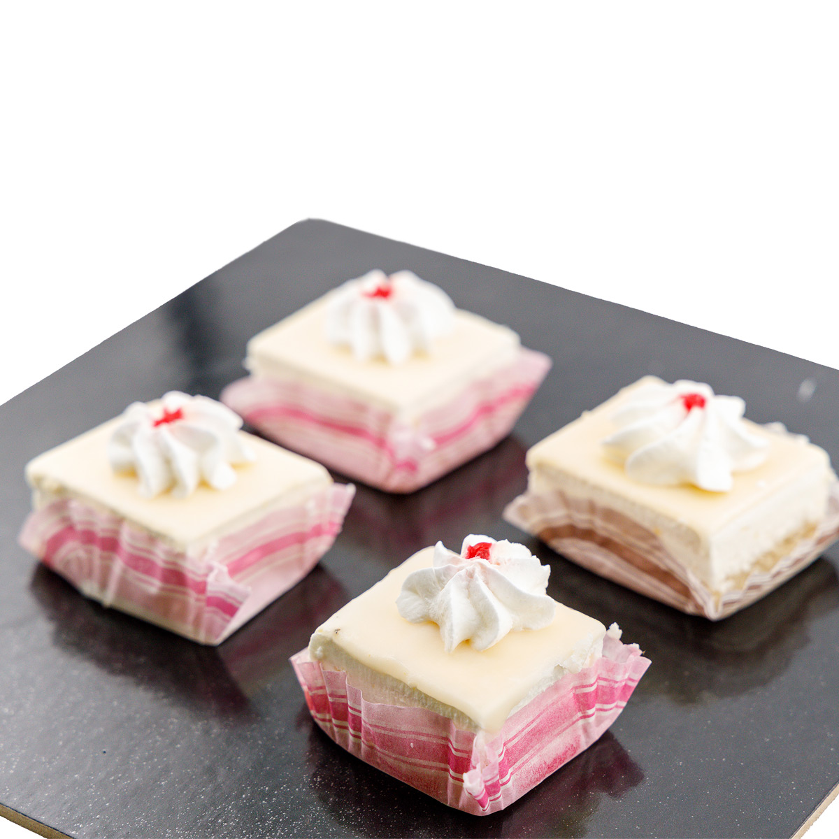 Παστάκια με βάση αφράτο παντεσπάνι και φίνα κρέμα βανίλιας, καλυμμένα με ελαφριά επικάλυψη λευκής σοκολάτας. Απαλή γεύση, ισορροπημένη γλυκύτητα και κλασικός ζαχαροπλαστικός χαρακτήρας. Ένα μικρό, κομψό γλύκισμα που ταιριάζει σε κάθε περίσταση.